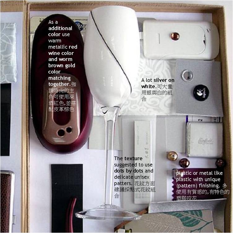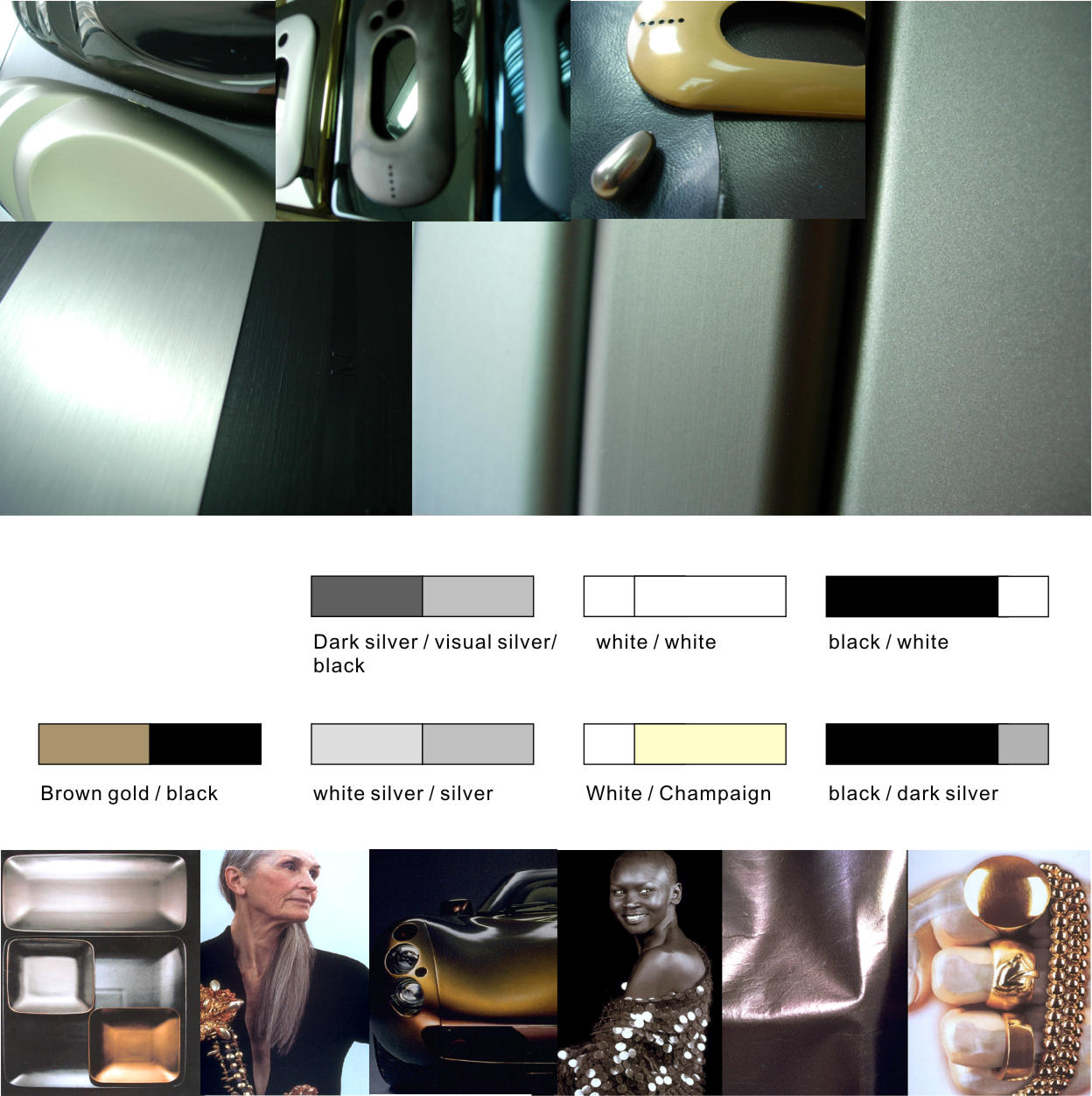 Each colour concept design followed user preferences studies, competitors overview and trend research. Base on the research we predicted the direction which new trends can evolve towards. We collected images, colours, finishes, material samples and field trips observations. Then we created material boxes to inspire the designers in their future designs. The designers were required to follow the defined colours and textures for each product segments.