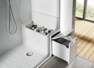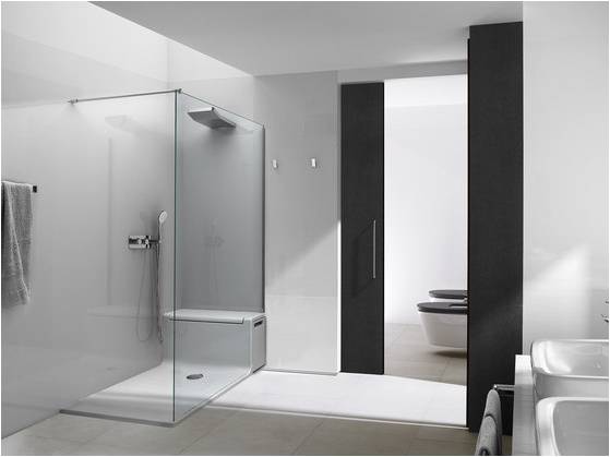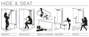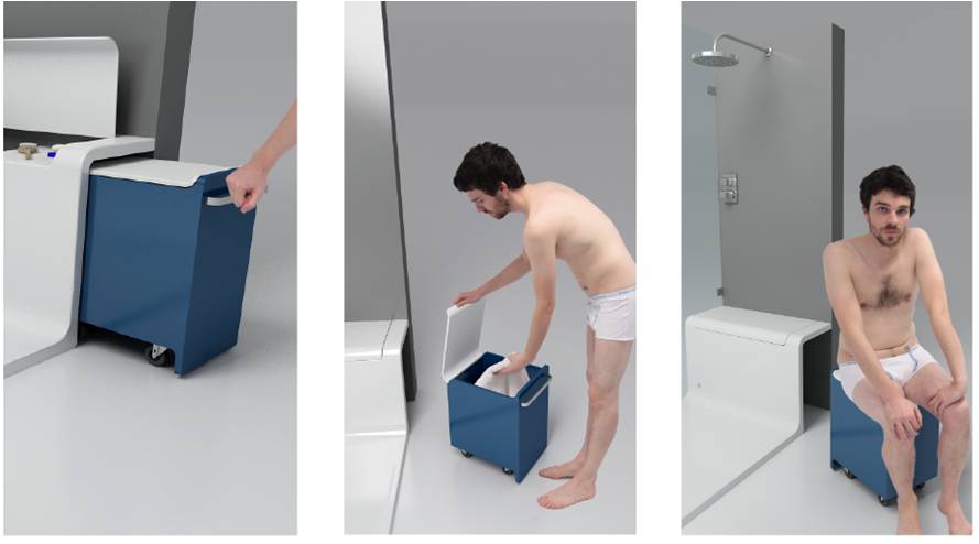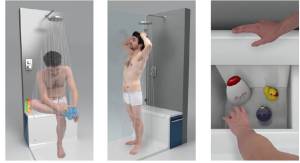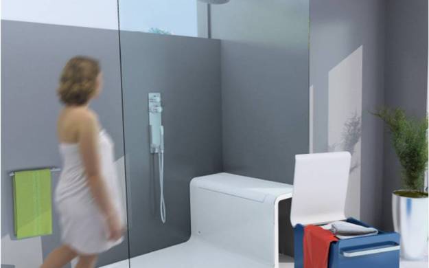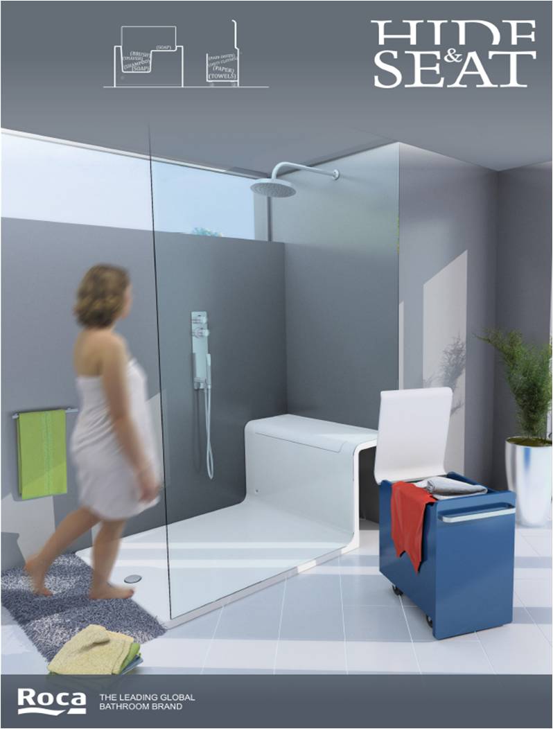 Hide & Seat redefines the shower area by integrating smart storage with seating and wellness features. The design includes an internal compartment for shower essentials, a retractable exterior seat with additional dry storage, a Maxiclean-treated glass panel, and premium fittings like a thermostatic faucet and wall-mounted sprinkler. The concept was unveiled at the ISH Fair in Frankfurt in 2011, representing a shift towards multi-functional bathroom environments centered around user comfort and convenience.