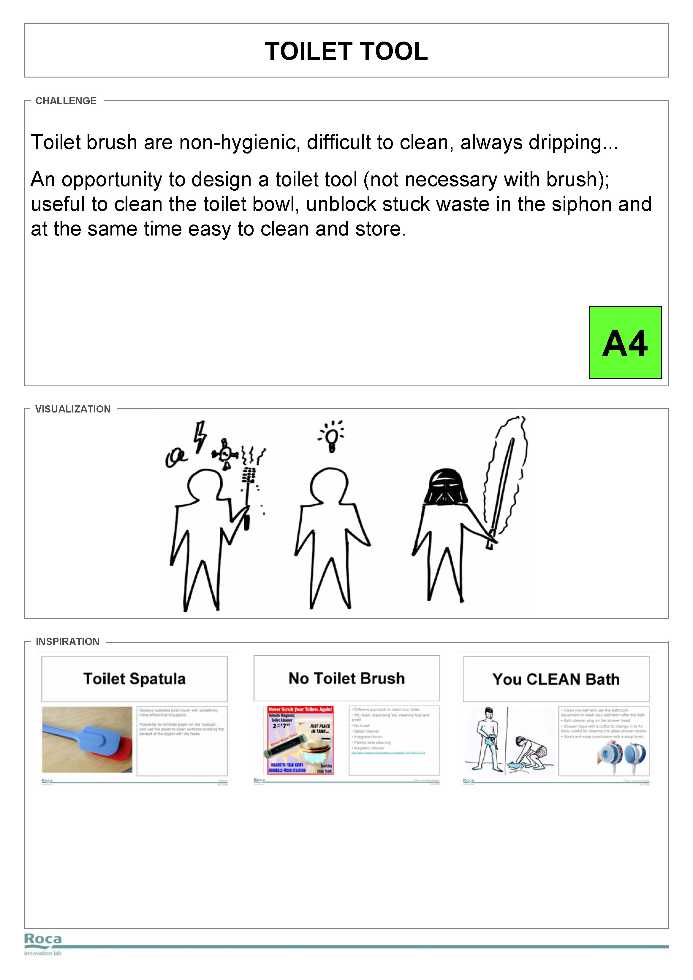 Roca’s innovation team was tasked with exploring the theme “Old problems, new solutions.” One frequently voiced complaint from users was that the toilet brush is the most unhygienic object in the bathroom, yet there was no widely accepted alternative. Our challenge was to find a more elegant and sanitary solution to this persistent problem.
